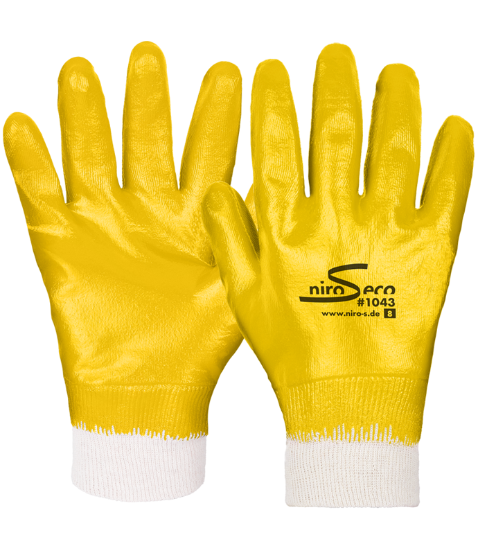 NIRO-S eco #1043: Nitril – Baumwoll – Handschuh, gelb, vollbeschichtet,  mit Strickbund. Der Handschuh bietet Schutz bei Arbeiten in nassen, öligen oder fettigen Arbeitsumgebungen. Die Nitrilbeschichtung geht bis zum Handgelenk und ist wasserdicht.