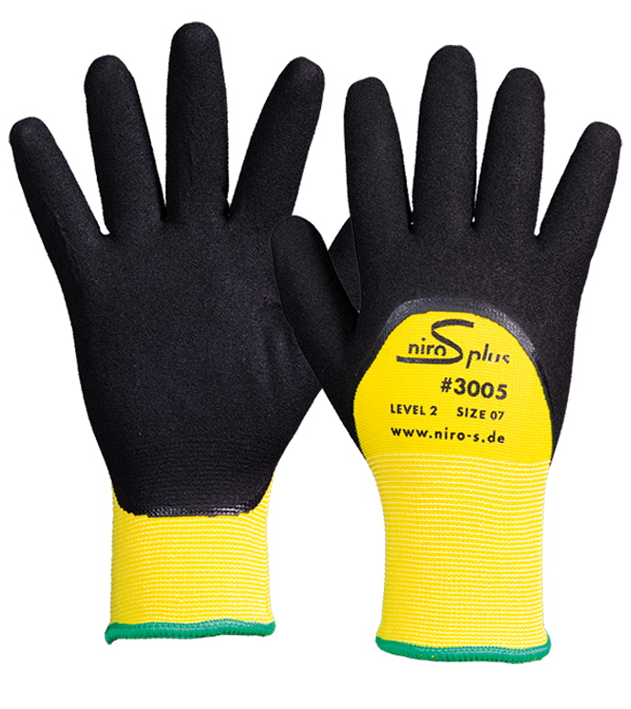 NIRO-S ice #3005: Kälteschutzhandschuh mit doppeltem Trägermaterial. Innen sorgt eine wärmende  10 Gauge Terry Schicht für einen angenehmen Hautkontakt. Außen sorgt eine zweite Schicht aus einem 15 Gauge Polyester Gewebe für zusätzlichen Kälteschutz. Die doppelte Nitrilbeschichtung ist gesandet  und knöcheltief getaucht.