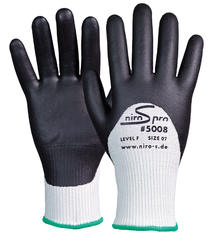 NIRO-S pro #5008: Schnittschutzhandschuh der höchsten Schnittschutzklasse F. Die 3/4 Nitrilschaumbeschichtung verleiht dem Handschuh einen extra Handrückenschutz gegen Fette und Öle und einen guten Griff auf trocken bis leicht feuchten Oberflächen. Robuster Handschuh für strapazierende Anwendungen.